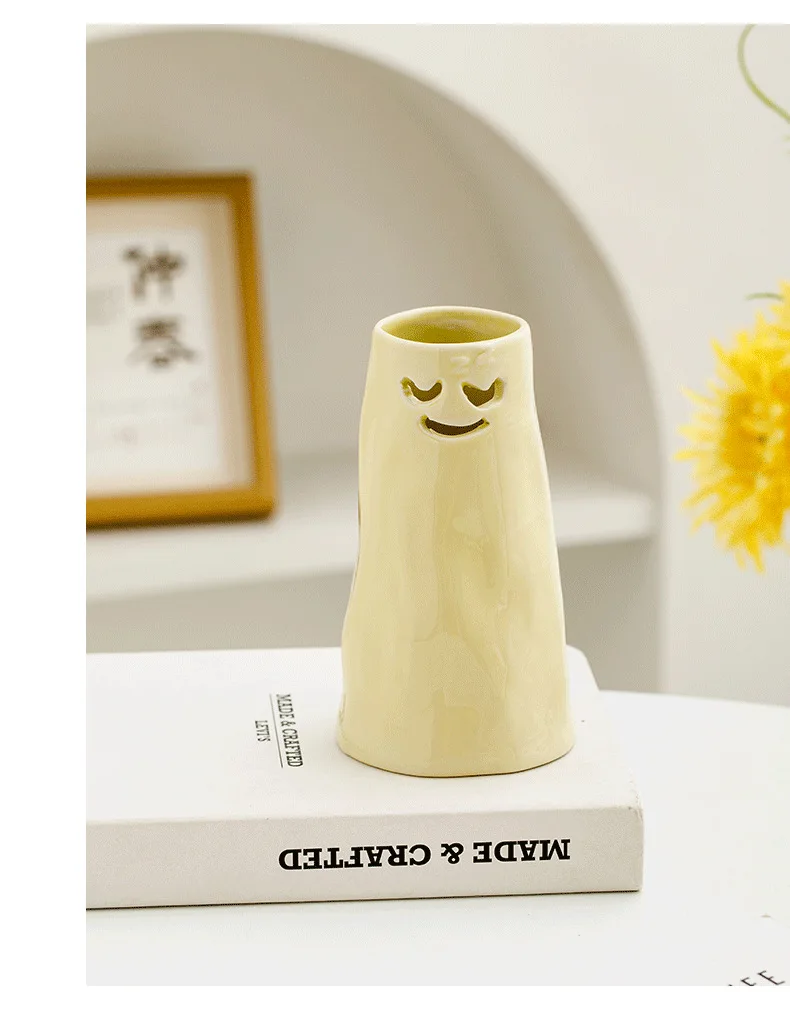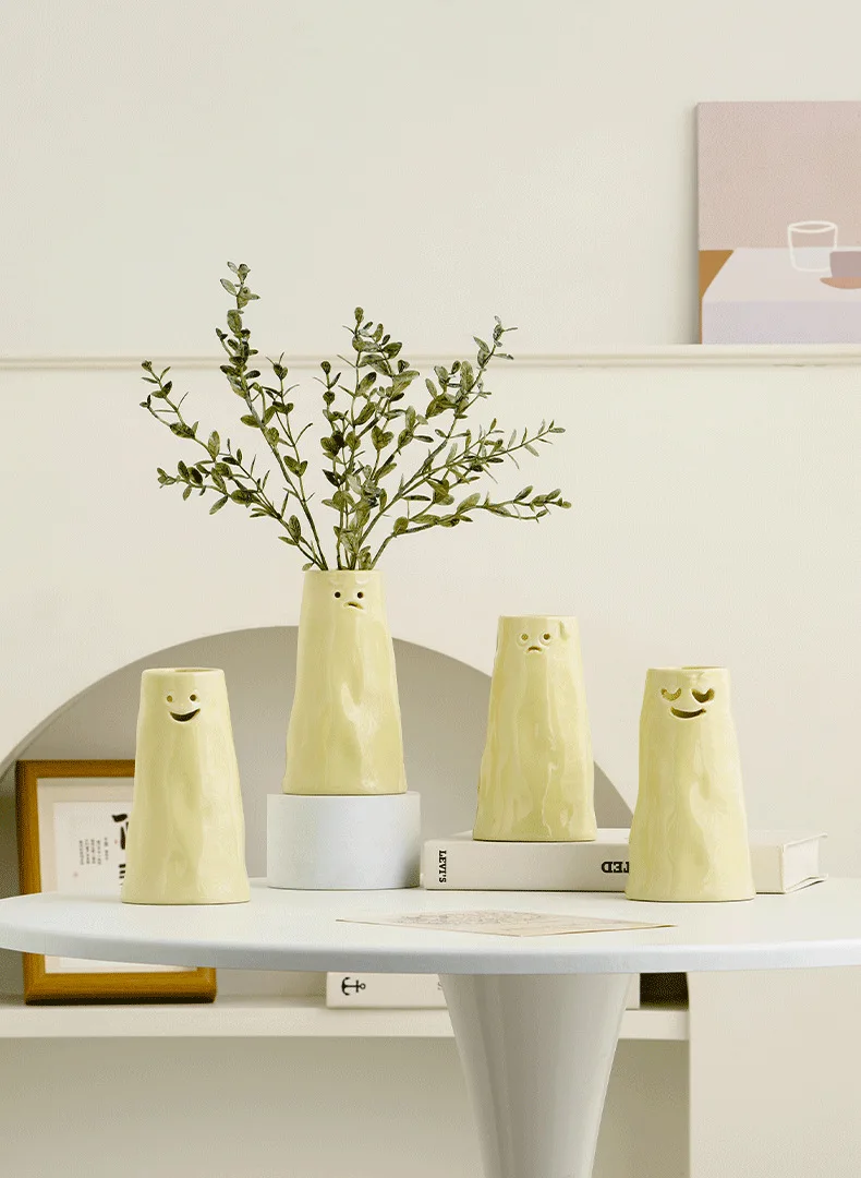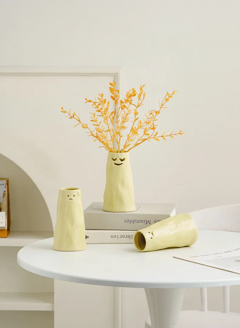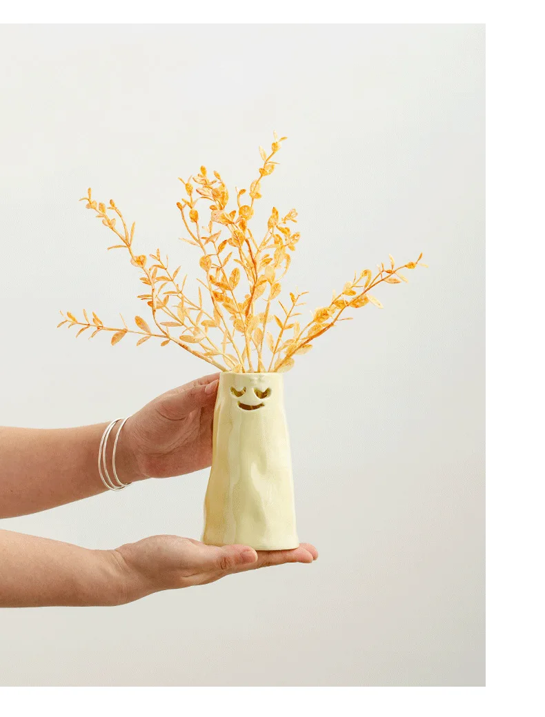 Our vases are finished in a beautiful, creamy yellow hue that instantly creates a warm and cheerful atmosphere. The funny facial expressions are carved directly into the ceramic, making each piece a delightful conversation starter.