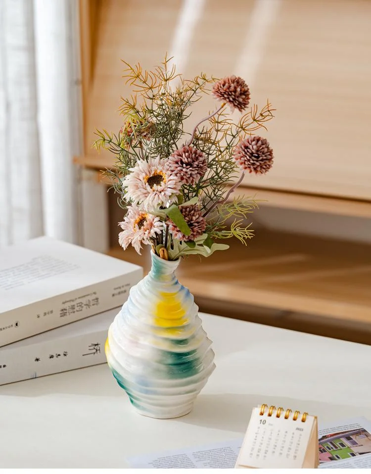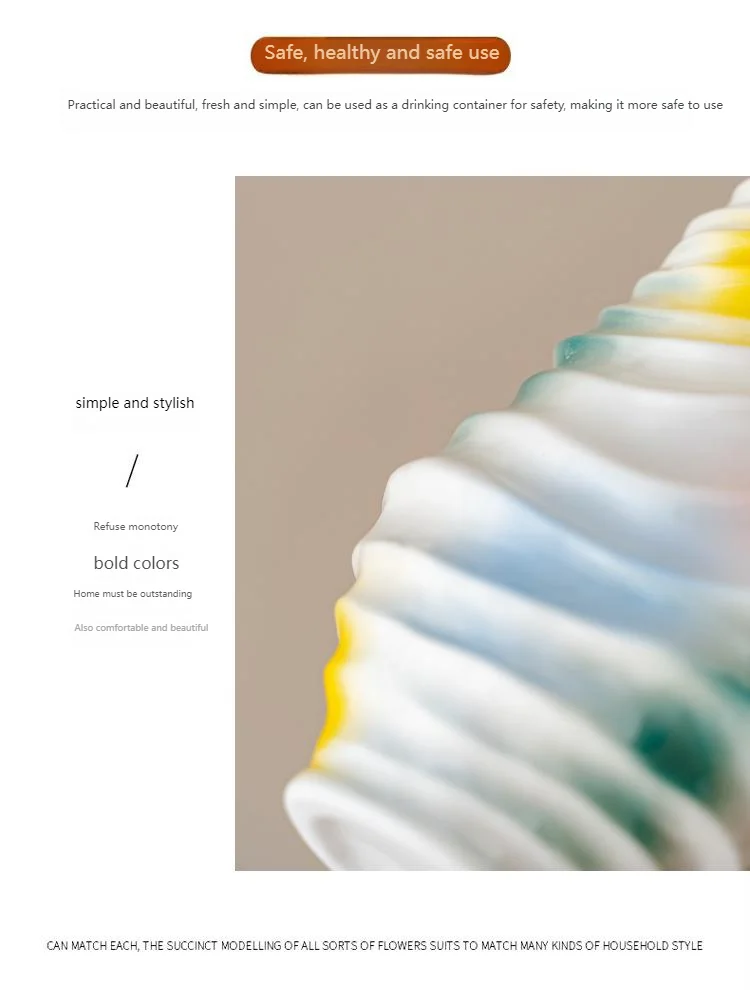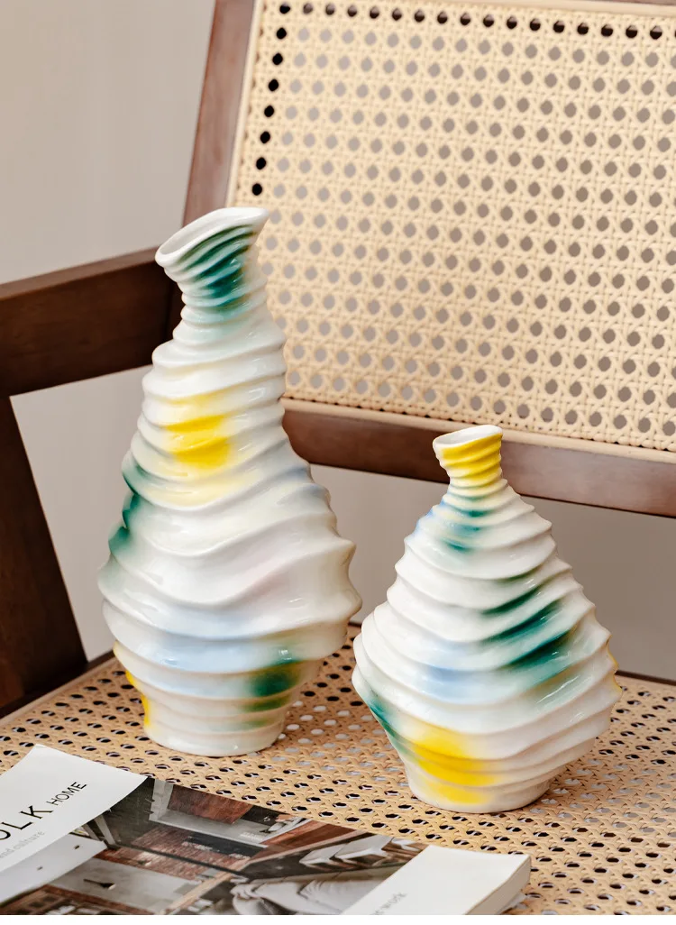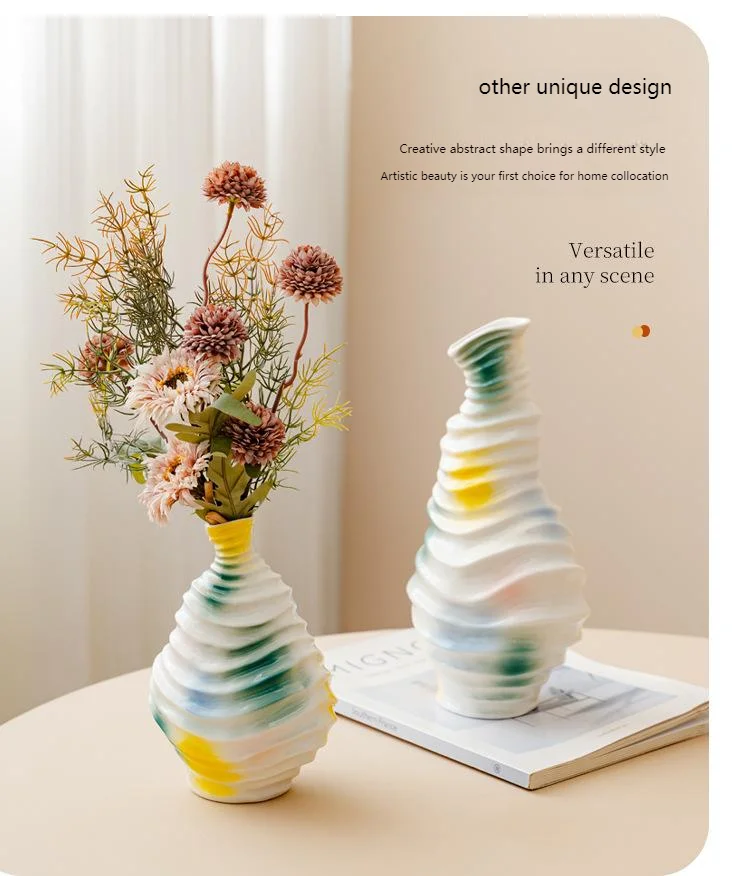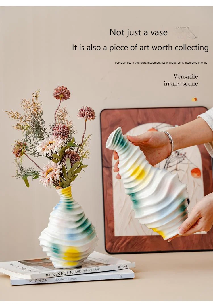 Bring a touch of modern art into your home with this beautiful wavy ceramic vase. Its unique, irregular shape and flowing, abstract glaze in vibrant colors (yellow, blue, and green) create a truly eye-catching piece.
