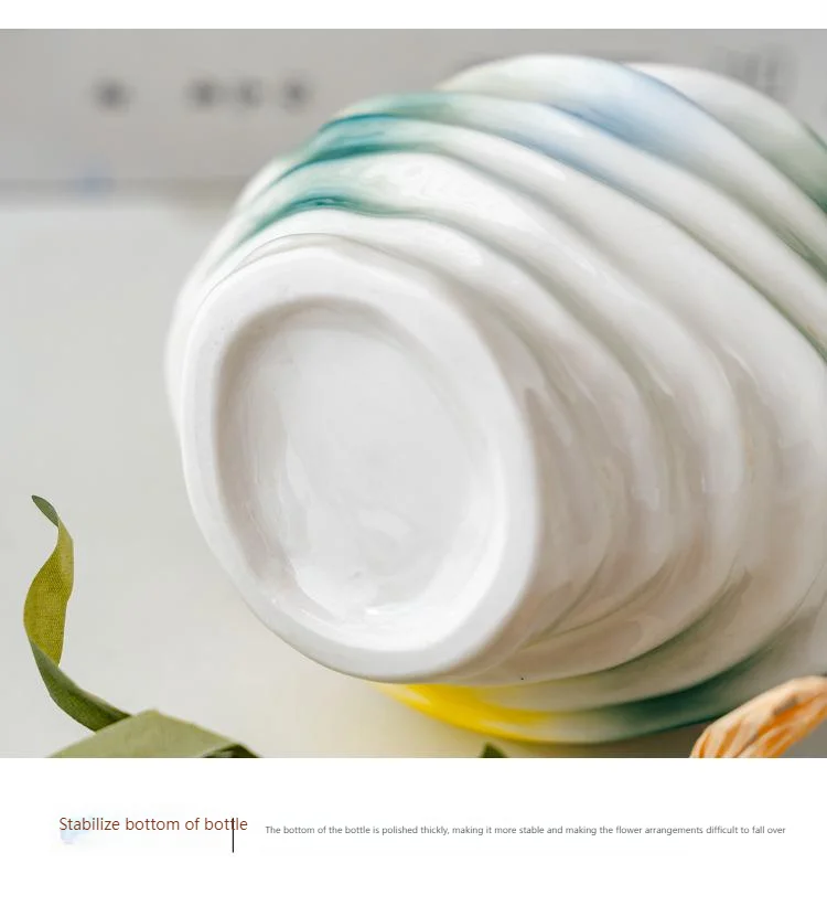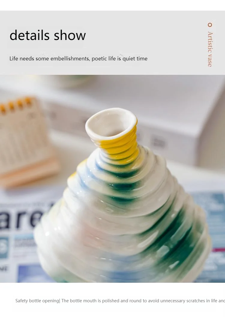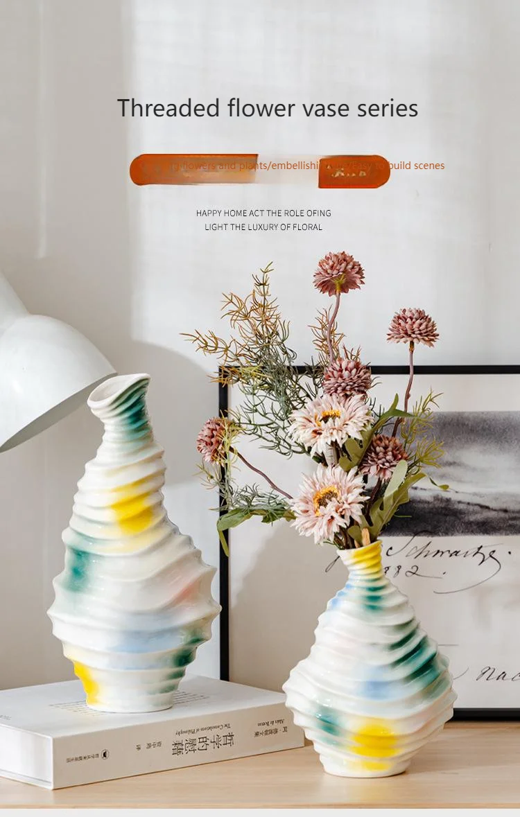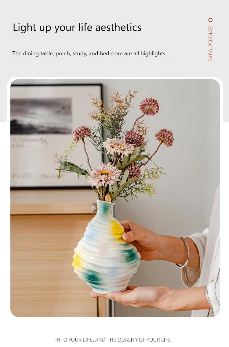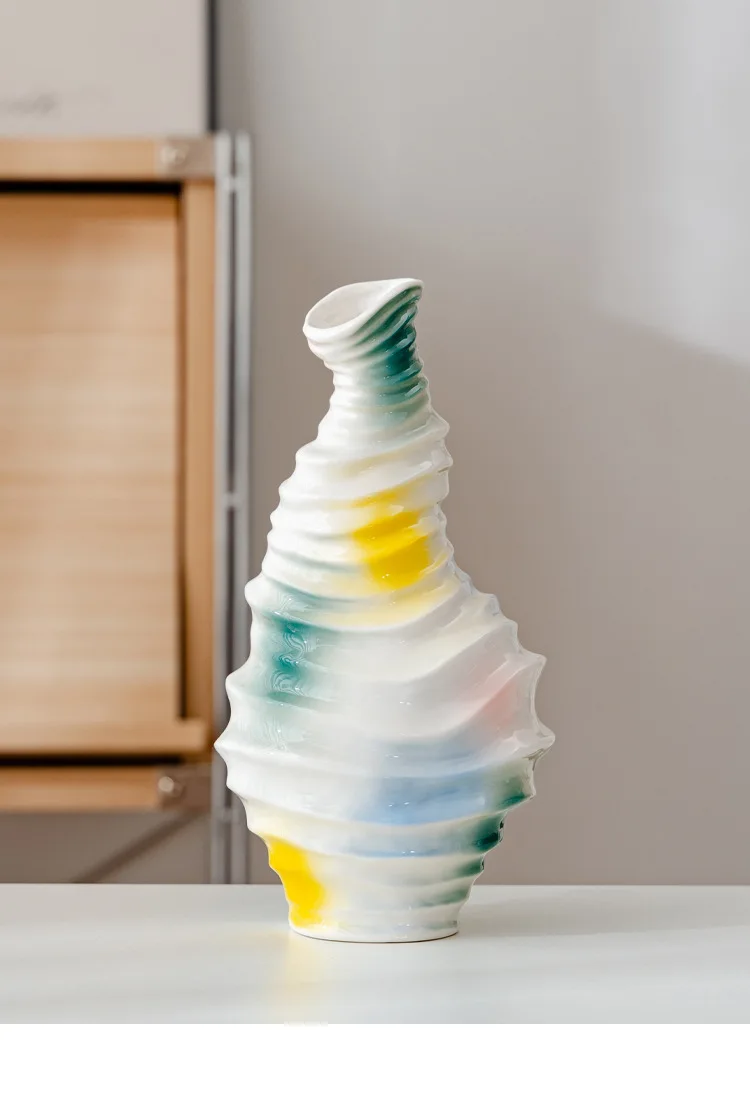 Bring a touch of modern art into your home with this beautiful wavy ceramic vase. Its unique, irregular shape and flowing, abstract glaze in vibrant colors (yellow, blue, and green) create a truly eye-catching piece.
